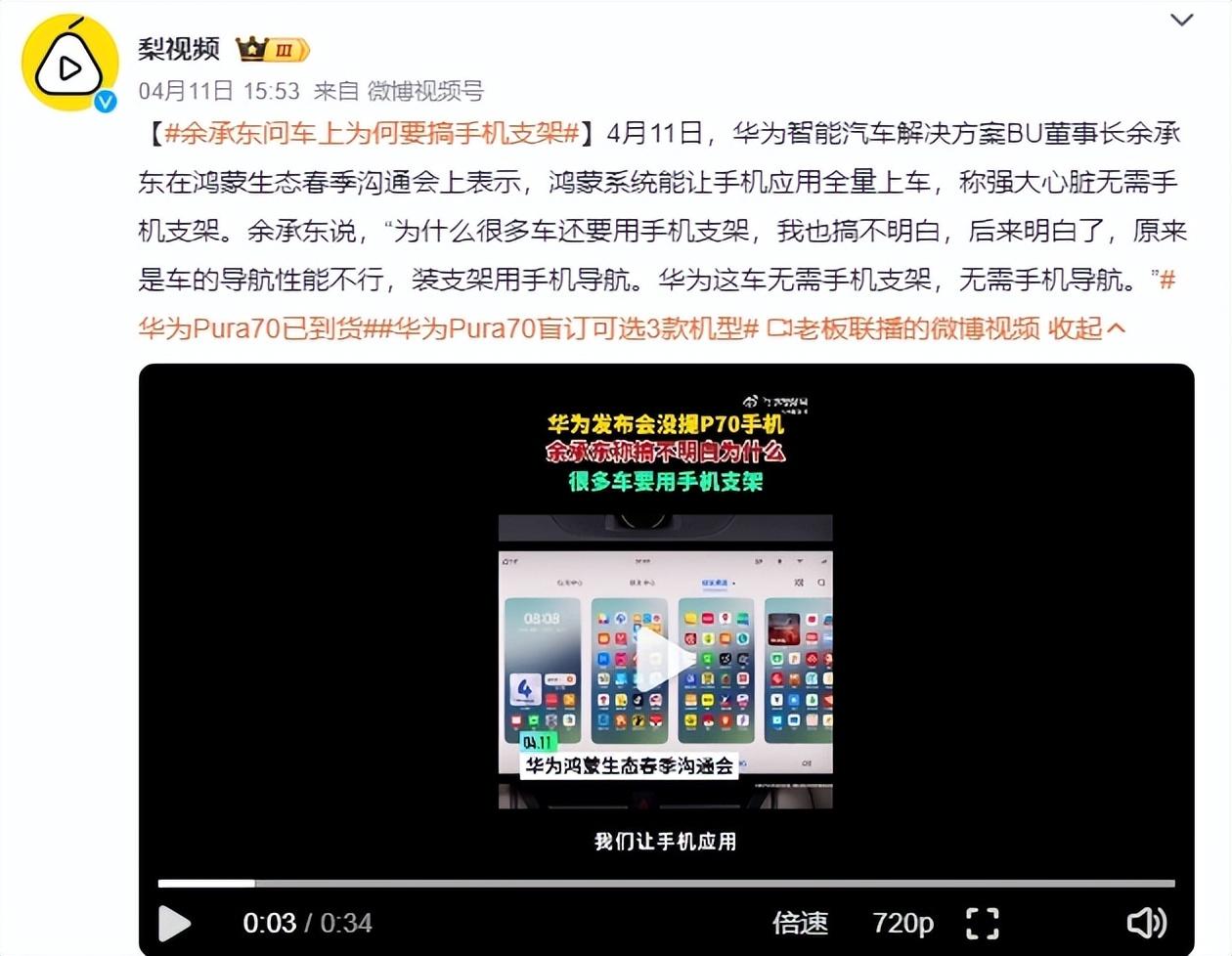 在發(fā)布智界S7時,余承東笑稱,“一開始想不明白為什么很多人還用手機支架,后來我明白了,是因為他們車的導航性能不行,需要用手機導航。”他表示,用華為鴻蒙智行的車,無需手機支架。