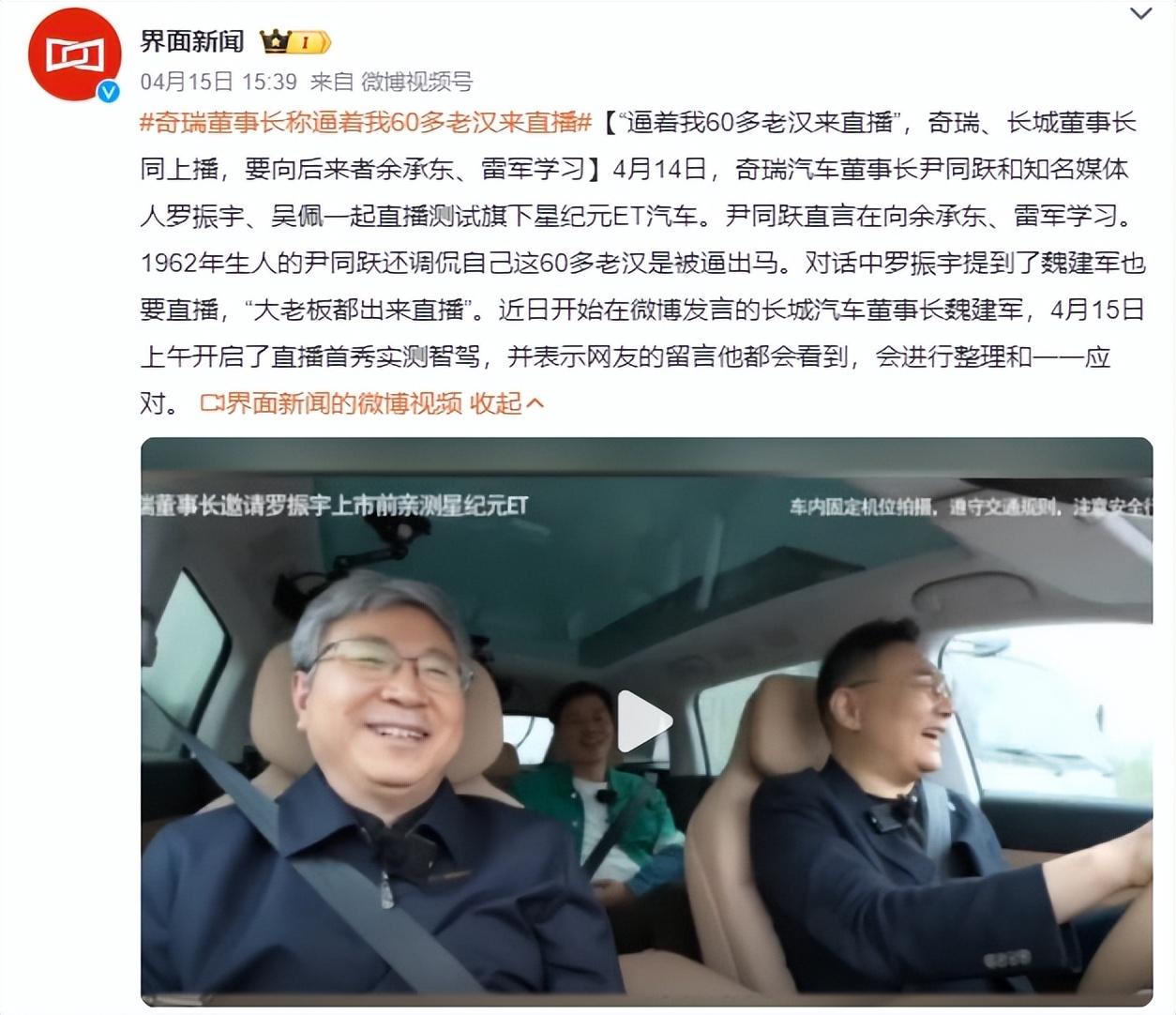 這些長時間深居簡出、隱于幕后的“車企大佬”,如今紛紛走向前臺開始“營業(yè)”;在此之前,直播還只屬于李斌等中青年“車企新勢力”。