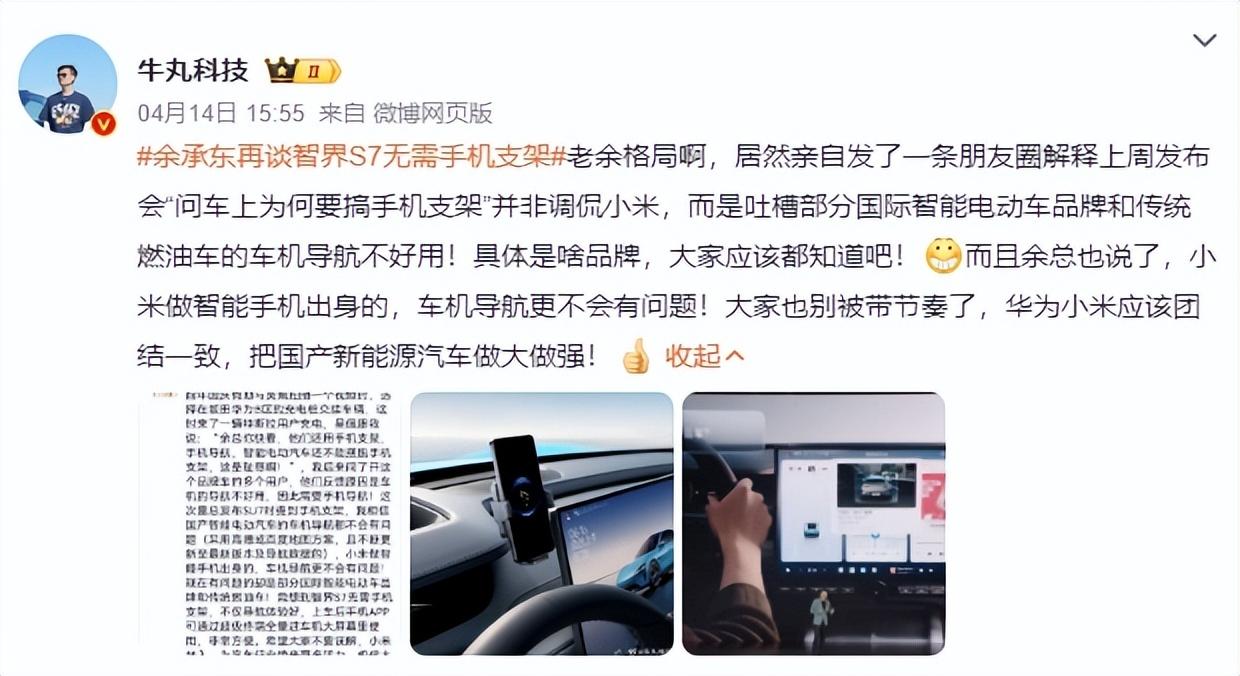 余承東的一個調(diào)侃就帶動了網(wǎng)友的討論熱度。因為,就在前不久小米SU7上市發(fā)布會上,雷軍還專門強調(diào)了其預留支架口的設計,并表示“發(fā)現(xiàn)所有的車廠都沒有考慮過手機支架怎么裝。我們一定要做最好的手機支架,手機廠造車一定要把這個問題給解決了”。