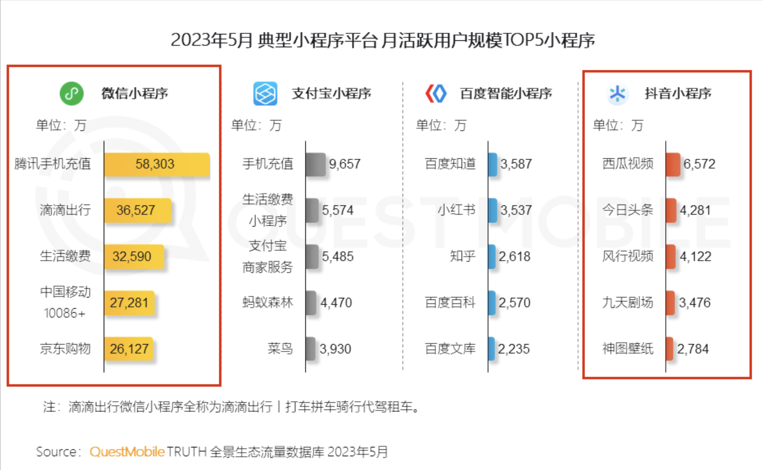 目前,抖音小程序的用戶量與微信小程序之間還有比較大的懸殊。QuestMobile《2023年全景生態(tài)流量半年報告》顯示,2023上半年,微信小程序MAU達(dá)到9.28億,同比增長4.7%;抖音小程序MAU為2.76億,同比增長11.2%。
