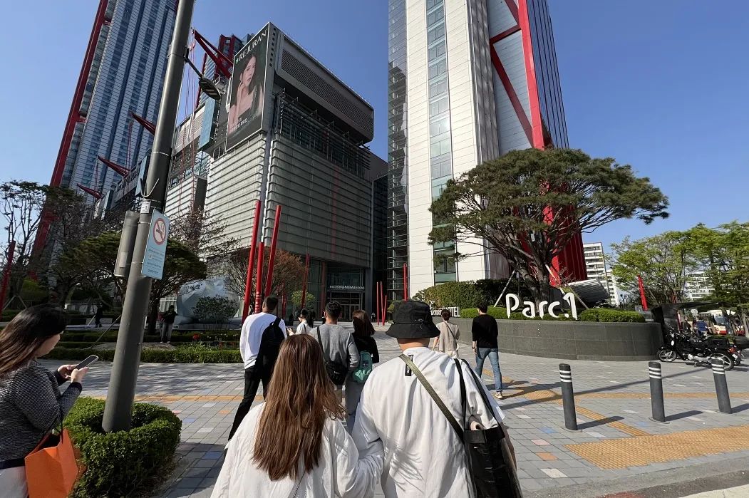 而距離公園步行五分鐘,在一眾灰白色寫字樓中,現(xiàn)代首爾百貨別具特色的紅色“腳手架”式外立面尤為醒目。