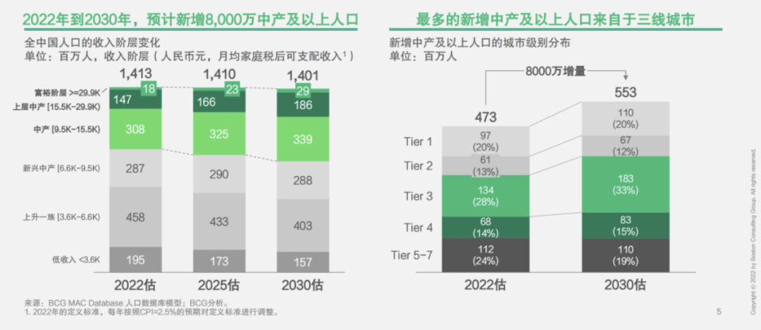 據(jù)BCG波士頓咨詢推出的《2023中國未來消費者報告:世代篇》報告數(shù)據(jù),預計到2030年,中國將再增加8,000萬中產及以上人口,其中超過70%新增中產來自于低線城市。