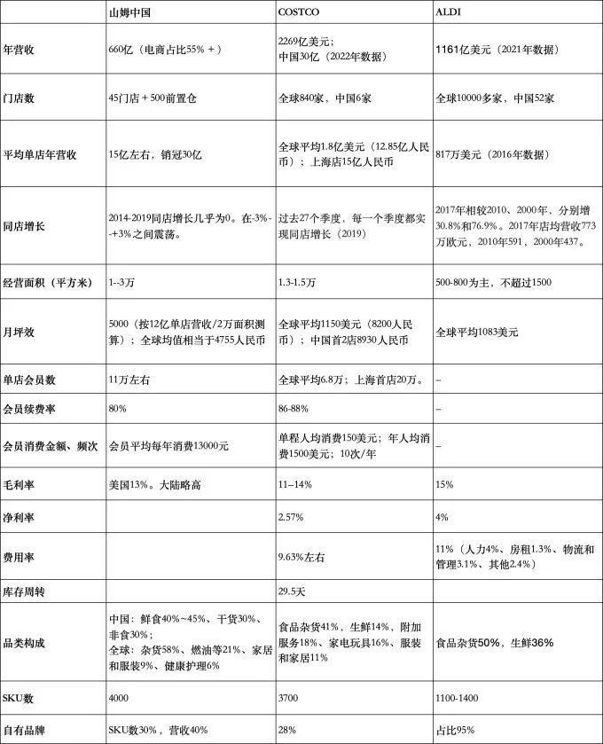 我做過一張圖,大致比較Costco、山姆中國和ALDI的經(jīng)營數(shù)據(jù)。