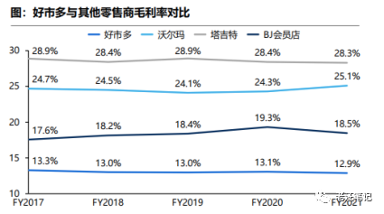 而傳統(tǒng)大賣場,如沃爾瑪基本在25%一線,便利店則大多在35%上下。