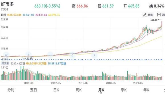 在全球范圍內(nèi),倉儲會員店鼻祖Costco,2023年?duì)I收2422億美元,凈利潤62.9億美元,市值突破3000億美元。最近5年凈利潤年均增幅15.1%;最近25年,股價(jià)從8.5漲至666。漲幅71倍,年化增幅高達(dá)19%+。