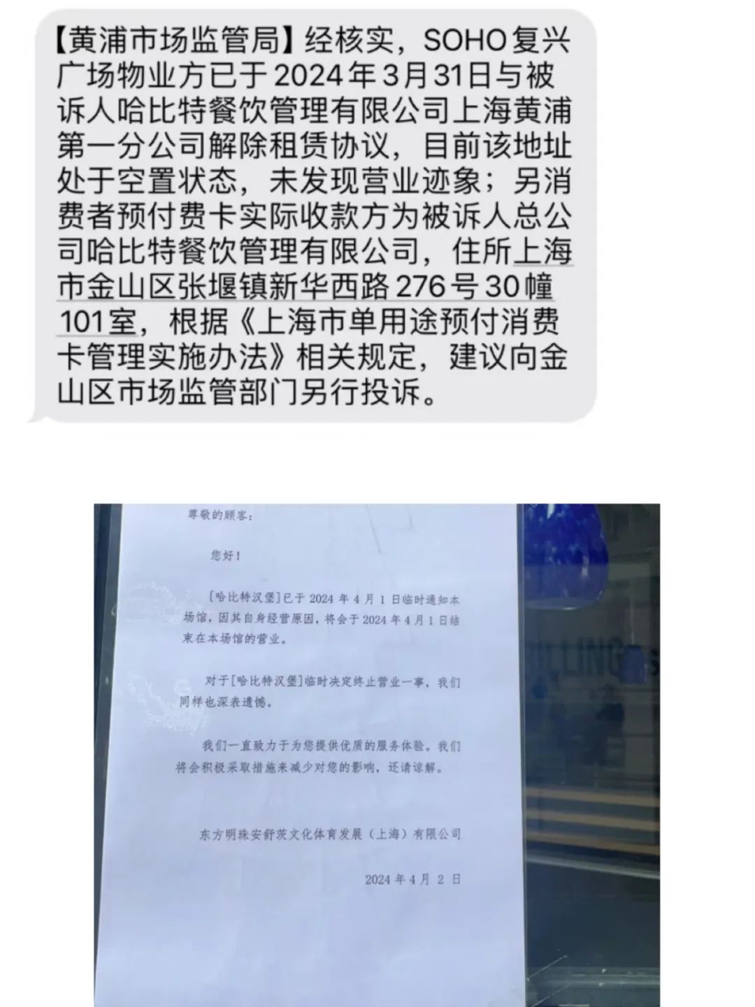 日前,復(fù)興SOHO、梅賽德斯奔馳文化中心購(gòu)物廣場(chǎng)陸續(xù)張貼了一張關(guān)于哈比特漢堡停止?fàn)I業(yè)的告知函。