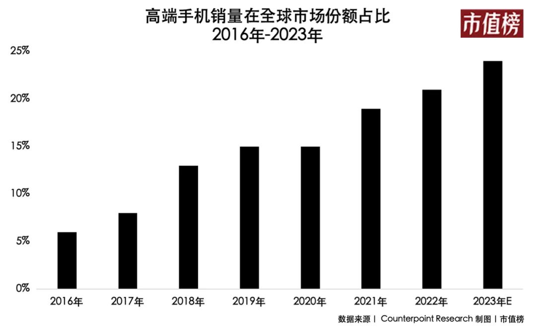 雖然全球智能手機整體出貨量在萎縮,但是自2014年以來,中國智能手機的 ASP(年平均出貨價格),一直保持增長。Counterpoint Research數(shù)據(jù)顯示,全球高端手機(批發(fā)價超過600美元)的市場份額也一直在增長,從2016年的6%增長至2023年的24%。