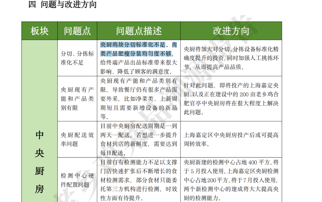 同時(shí),老鄉(xiāng)雞也指出在專項(xiàng)行動(dòng)中發(fā)現(xiàn)的問題。比如,在中央廚房的溯源過程中,老鄉(xiāng)雞發(fā)現(xiàn)分切、分揀標(biāo)準(zhǔn)化不足,易導(dǎo)致雞塊大小,和葷素分配不均勻。且大部分產(chǎn)品仍以冷凍形式進(jìn)行儲(chǔ)存,對(duì)于口感有一定的影響。