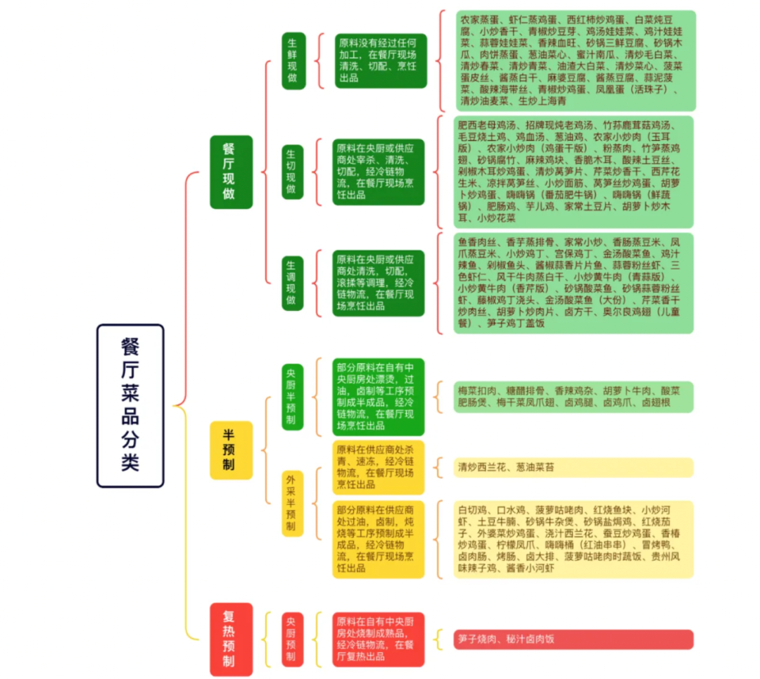 按照分類,肥雞老母湯、農(nóng)家蒸蛋、魚香肉絲等菜品是餐廳現(xiàn)做;梅菜扣肉、鹵雞腿等屬于半預(yù)制;筍子燒肉、秘汁鹵肉飯屬于復(fù)熱預(yù)制。