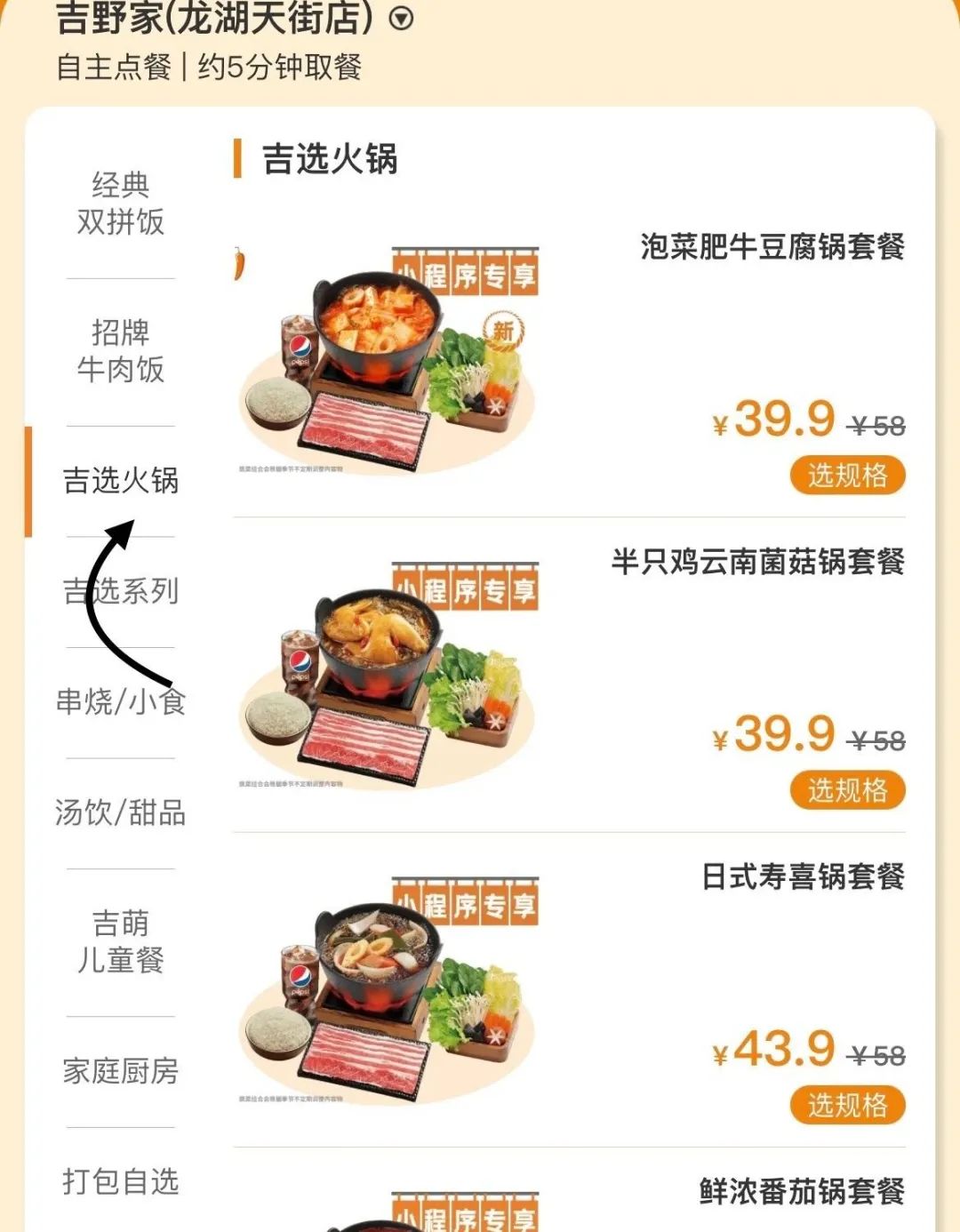 現(xiàn)如今,吉野家小火鍋已經(jīng)沒有獨立的門店,而是在原來的門店招牌上加了火鍋二字“吉野家 火鍋.牛肉飯”,在吉野家小程序上可以看到“吉選火鍋”系列,共有5種sku可以選擇,主要是以套餐形式售賣,價格在39.9-43.9之間,人均40左右,醬料另加3元。