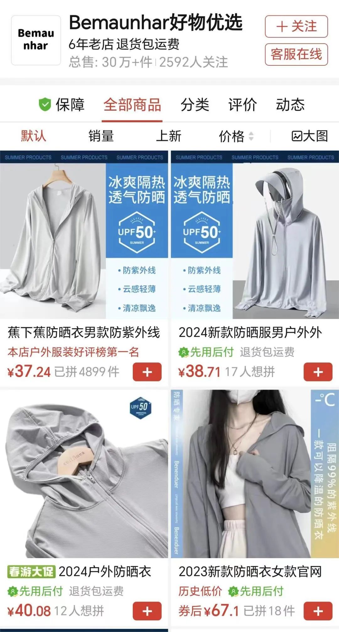 第二類,想和品牌搶奪防曬衣蛋糕,但不愿意花時間、花成本進行產(chǎn)品研發(fā)的不良白牌。這些不良白牌,基本靠低價“山寨品牌”收割消費者。