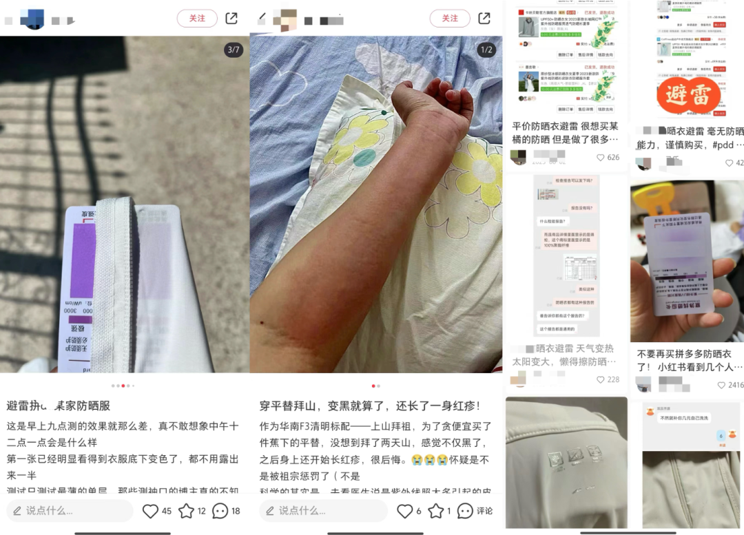 在小紅書上,有大量的博主抱怨自己嘗試了平替產(chǎn)品后,結(jié)果曬傷甚至過敏、皮疹的情況。有位年輕媽媽在夜市上花20塊買了件防曬衣,結(jié)果兒子穿上不但沒防曬,還渾身起紅疹進了醫(yī)院。
