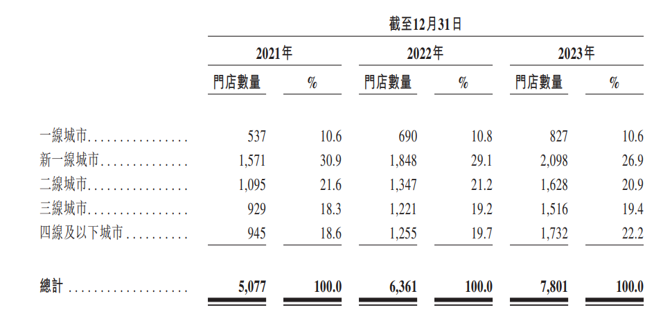 截至2024年4月5日,茶百道在中國共有8016家門店,遍布全國31個省市,實(shí)現(xiàn)中國所有省份及各線級城市的全覆蓋。招股書顯示,茶百道成為國內(nèi)第三大現(xiàn)制茶飲品牌,僅次于蜜雪冰城、古茗。