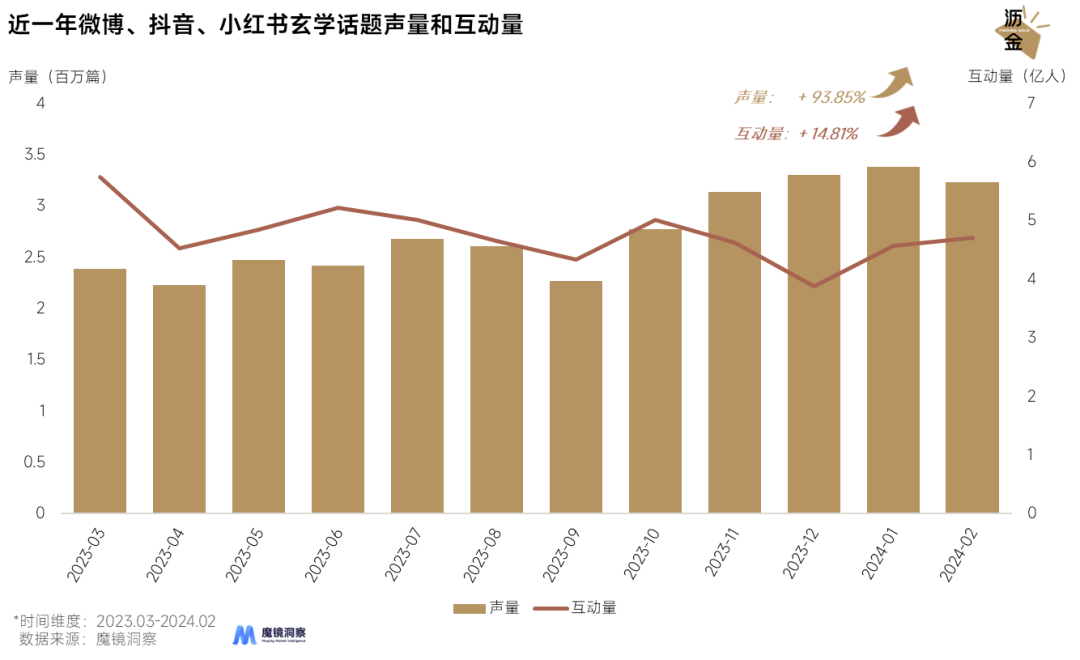 近一年微博、抖音、小紅書玄學話題聲量和互動量