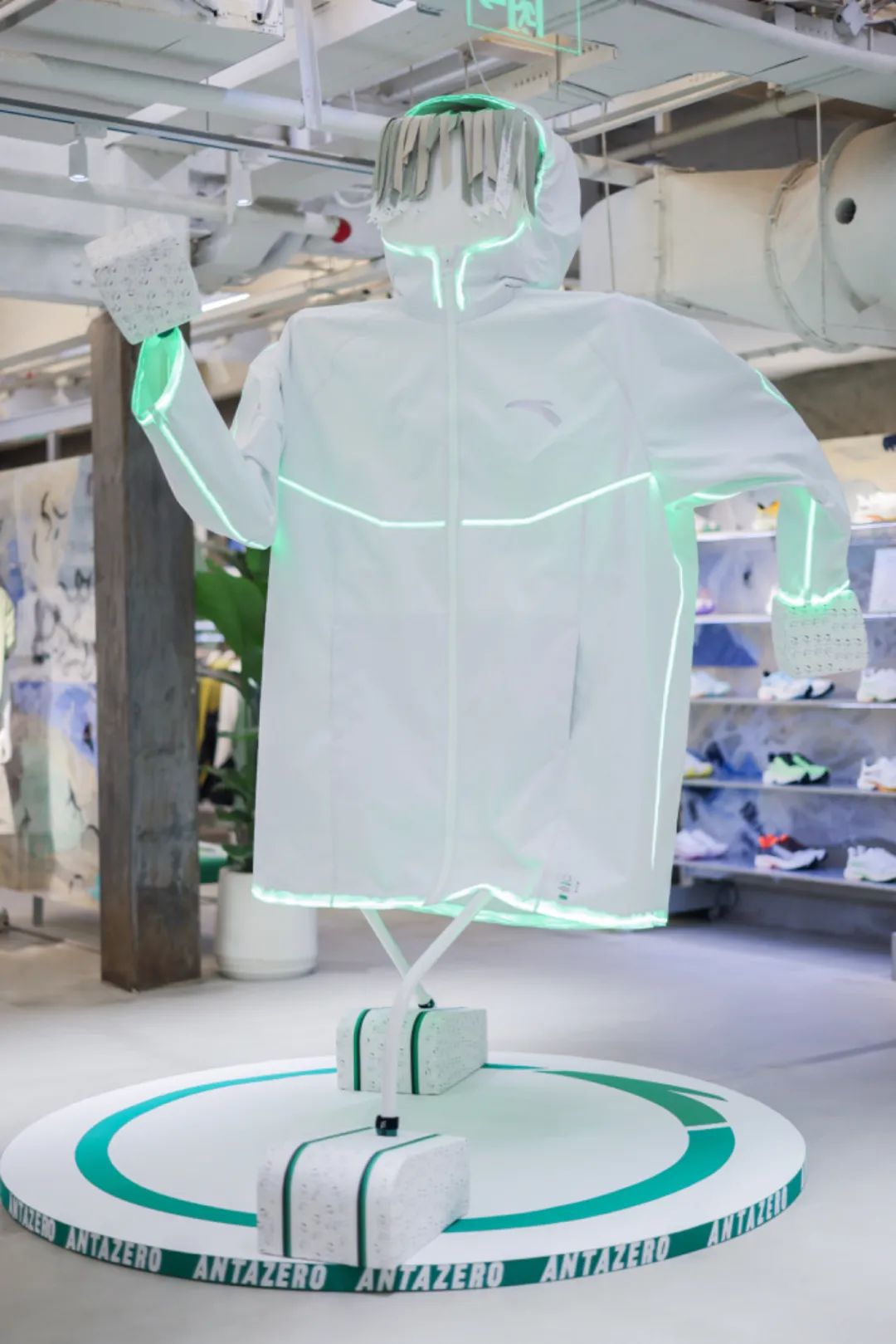 在450平方米的門店空間內(nèi),安踏通過可持續(xù)藝術(shù)呈現(xiàn)形式生動(dòng)展示「可持續(xù)之美」,并將「0碳生活方式」傳遞出去;作為門店「骨骼」與「血肉」的裝修材料和產(chǎn)品陳列器架、道具等也都是生產(chǎn)過程中的剩余面料制作而成,強(qiáng)化門店的「0碳」肌理。