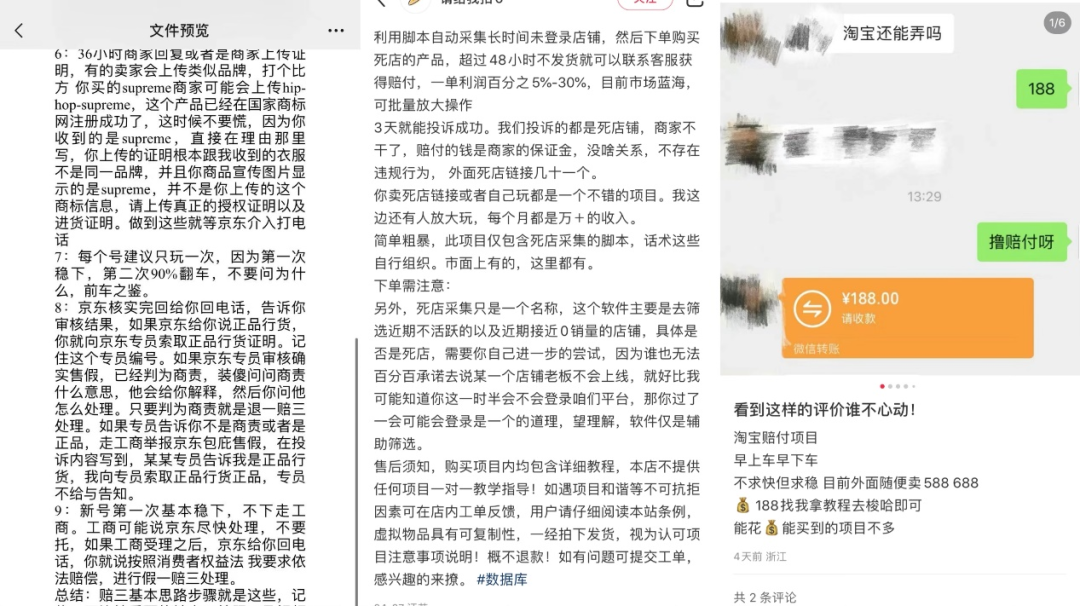 鋅刻度在各大社交媒體搜索發(fā)現(xiàn),這些項(xiàng)目大多被稱為“賠付項(xiàng)目”,針對(duì)拼多多、京東和淘寶等各大電商平臺(tái)。這些項(xiàng)目主要通過(guò)社群進(jìn)行,進(jìn)群后根據(jù)教程操作,下單后延遲發(fā)貨或者有漏洞的商品,或是質(zhì)疑商家售假,從而退貨并聯(lián)系客服賺賠付,前者賠付一般一單100元,質(zhì)疑售假則可能“假一賠三”。而普通人一般有兩種“上車”方式,一是支付38.8元-188元不等的教程費(fèi),另一種則是免費(fèi)“上車”,但每單收益需向群管理員交提成,比例為30%-50%不等。