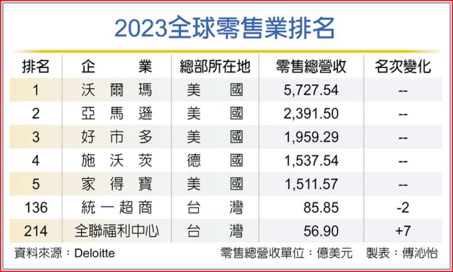 根據(jù)2023年德勤公開財(cái)報(bào),評選出全球前250大零售業(yè)(Top 250),臺(tái)灣全聯(lián)企業(yè)入榜, 排名第214名。 (臺(tái)灣全聯(lián)則是連續(xù)三年入榜,本次以總營收56.9億美元,排名上升七名至214名;全聯(lián)自2021年首度進(jìn)榜,排名一路自247名、221名,進(jìn)步至214名。)