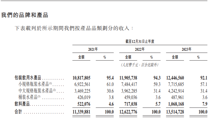 招股書顯示,2021年到2023年,華潤飲料的總營收分別為113.4億元、126.23億元、135.15億元,年內(nèi)利潤分別為8.58億元、9.89億元、13.31億元。可以看到,2021年到2023年,華潤飲料的總營收和利潤都在穩(wěn)定增長。另外,華潤飲料的凈利潤率,也從2021年7.6%增加到了2023年的9.9%。其中,華潤飲料大部分的收入都來自于以怡寶為主的包裝飲用水產(chǎn)品。2021年到2023年,華潤飲料來自于包裝飲用水產(chǎn)品的收入在總營收中的占比均超過90%,小規(guī)格瓶裝水產(chǎn)品占比則超過了50%。