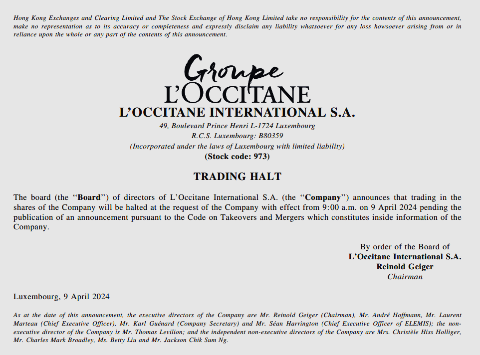 4月9日,法國(guó)護(hù)膚品集團(tuán)歐舒丹L'OCCITANE(00973.HK)在港交所發(fā)布公告稱:“上午9時(shí)起短暫停牌,以待發(fā)布一則根據(jù)公司收購(gòu)及合并守則并構(gòu)成內(nèi)幕消息的公告!苯刂亮闶凵虡I(yè)財(cái)經(jīng)發(fā)稿前,歐舒丹在港交所仍處于停牌的狀態(tài)。
