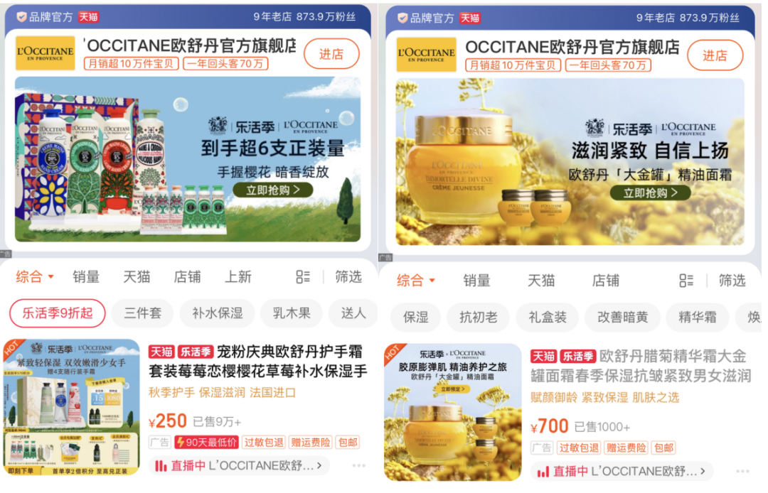 去年9月,歐舒丹和李佳琦合作推出了30ml售價(jià)700元的“蠟菊修護(hù)精華霜”。然而,該產(chǎn)品在天貓旗艦店的銷量?jī)H有1000余件,遠(yuǎn)低于護(hù)手霜套裝的9萬件銷量。