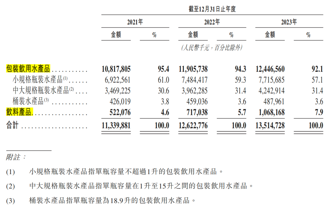 其中,包裝飲用水產(chǎn)品2021年-2023年分別實(shí)現(xiàn)收入約為108.18億元、119.06億元及124.47億元;其他飲料產(chǎn)品則分別實(shí)現(xiàn)收入為5.22億元、7.17億元及13.51億元。
