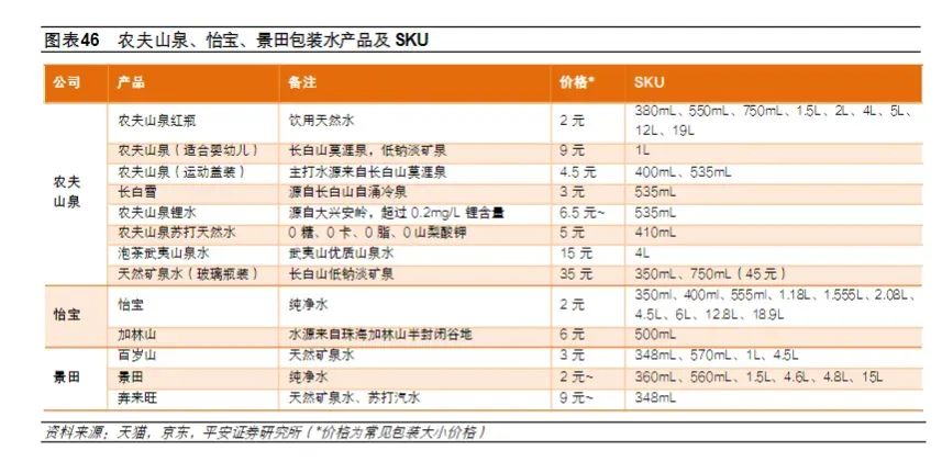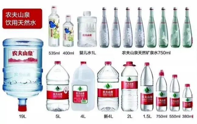 以農(nóng)夫山泉為例,除經(jīng)典紅瓶款之外,還開(kāi)發(fā)了適合嬰幼兒的天然水、主打雪水的長(zhǎng)白雪,以及武夷山泉水等八個(gè)系列,容量規(guī)格多達(dá)十幾種。
