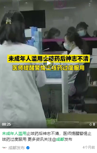 4個(gè)月前,四川成都警方發(fā)現(xiàn)了4名未成年人存在濫用右美沙芬片,其中有3名人員出現(xiàn)手舞足蹈、精神亢奮的狀況,另外一名則神志不清、認(rèn)知模糊,被送往醫(yī)院救治。