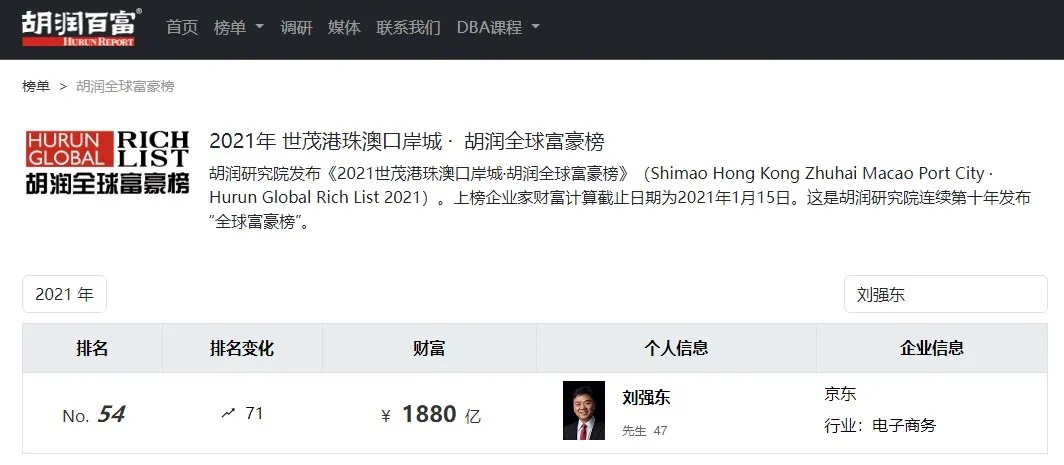劉強(qiáng)東2021胡潤全球富豪榜排名