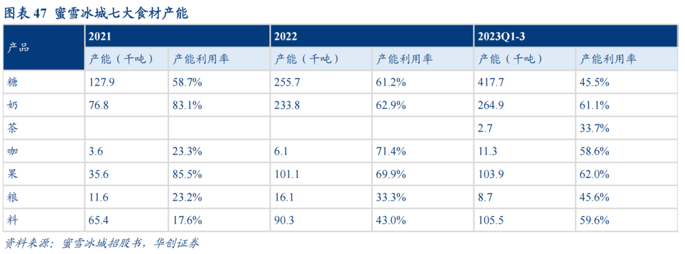 蜜雪冰城采購源自全球六大洲、35個國家的原材料,同時將采購網(wǎng)絡(luò)延伸到上游,建立原材料合作種植基地。河南、海南、廣西、重慶、安徽的五大生產(chǎn)基地年綜合產(chǎn)能約143萬噸,產(chǎn)能充足。提供給加盟商的飲品食材中60%為自產(chǎn),核心飲品食材為100%自產(chǎn)。