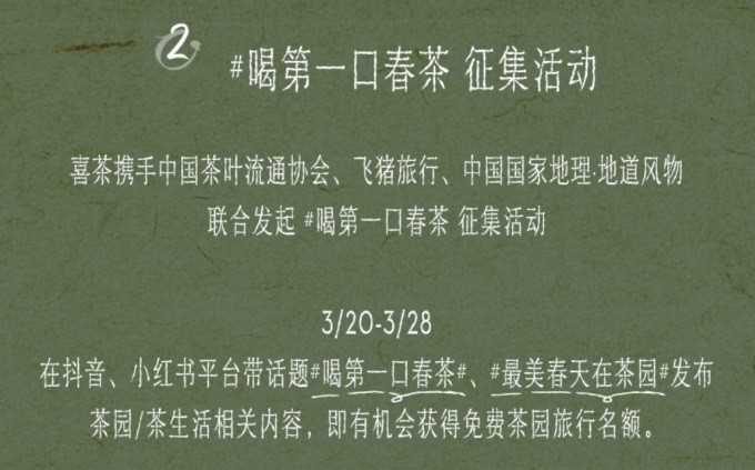 不僅是產(chǎn)品,3月20日,喜茶還聯(lián)合中國茶葉流通協(xié)會(huì)、中國國家地理·地道風(fēng)物、飛豬旅行發(fā)起了“喝第一口春茶”最美春茶園及喜悅茶生活征集活動(dòng),號(hào)召更多人在春茶季去茶園感受中國最美的春天,為春茶季注入更鮮活的用戶體驗(yàn)。活動(dòng)吸引了眾多網(wǎng)友積極參與,社交媒體平臺(tái)上#喝第一口春茶#等話題閱讀總量超1100萬。