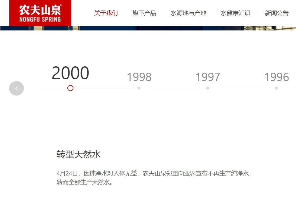 直至今日,農(nóng)夫山泉的官網(wǎng)大事記還顯示,因純凈水對人體無益,公司在2000年4月24日鄭重向業(yè)界宣布不再生產(chǎn)純凈水,轉(zhuǎn)而全部生產(chǎn)天然水。