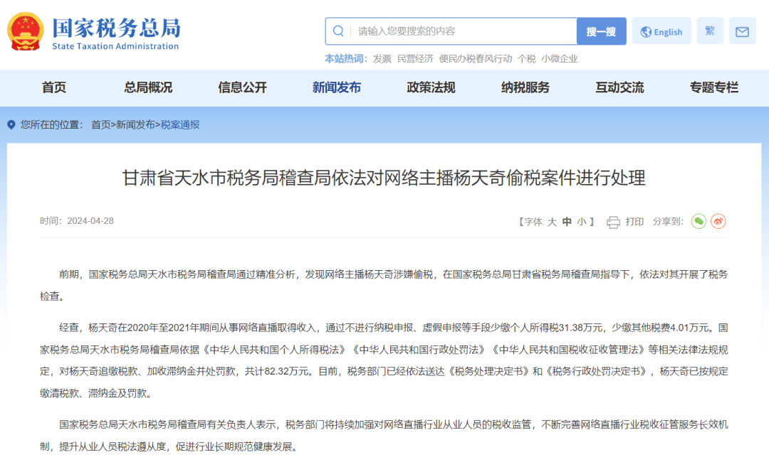 根據(jù)相關(guān)法律法規(guī)規(guī)定,稅務(wù)部門已對楊天奇追繳稅款、加收滯納金并處罰款,共計82.32萬元。