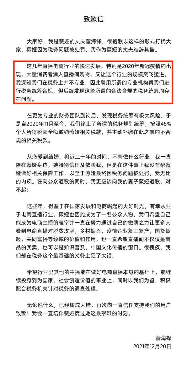 比如和小七一樣,認(rèn)為主要過錯不在自身的薇婭。當(dāng)初因偷逃稅被罰13.41億元后,謙尋董事長、薇婭的丈夫董海鋒曾發(fā)布致歉信,聲稱是因為此前聘用了所謂的專業(yè)機構(gòu)進行稅務(wù)統(tǒng)籌合規(guī),但后續(xù)發(fā)現(xiàn)這些所謂的合法合規(guī)的稅務(wù)統(tǒng)籌均存在問題,這才導(dǎo)致其被追繳稅款、加收滯納金并處罰款共計為13.41億元。