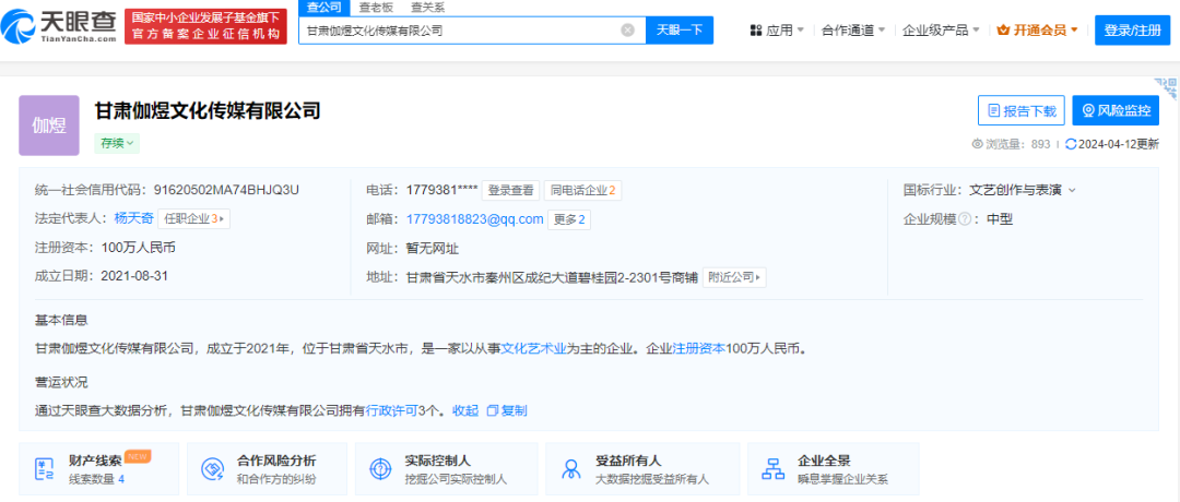 天眼查信息顯示,“小七”楊天奇本人還是甘肅伽煜文化傳媒有限公司的實際控制人,同時擔(dān)任法定代表人、執(zhí)行董事兼總經(jīng)理,持股比例100%。