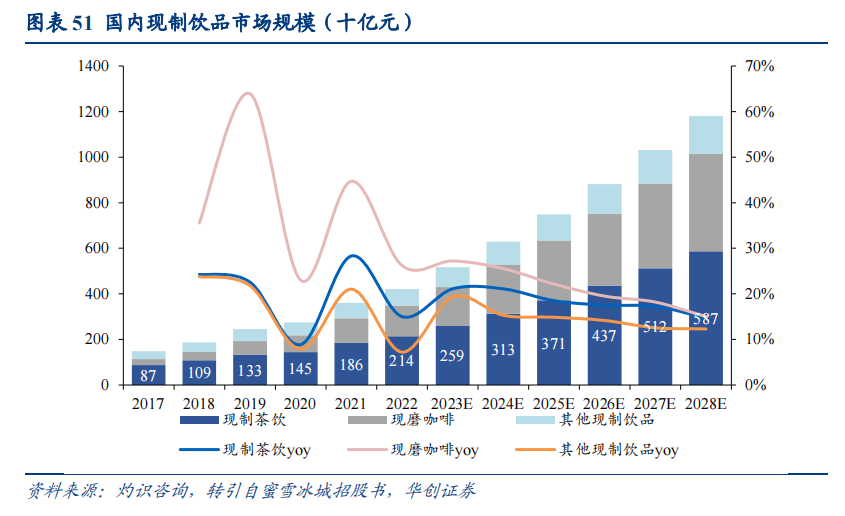 在各路資本的助推下,短短幾年的時間里,以新式茶飲為代表的現(xiàn)制茶飲市場規(guī)模由2017年的873億人民幣增長至2022年的2137億元,年復(fù)合增長率達到了19.6%。根據(jù)華創(chuàng)證券的預(yù)計,到2028年國內(nèi)現(xiàn)制茶飲市場規(guī)模還將進一步增長至 5871億元,年復(fù)合增速將維持在18.3%的高位。