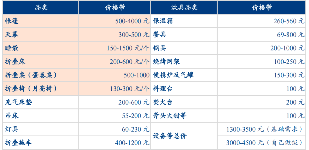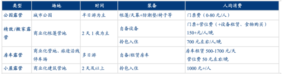 露營地消費(fèi)門檻相對較低,人均消費(fèi)150-200 元/天。從目前市場發(fā)展來看,系統(tǒng)化、標(biāo)準(zhǔn)化、規(guī)模較大的露營地有途居露營、樂營國際營地、山隱西江、嗨king等等。途居露營主要針對房車露營地,嗨king更多在景區(qū)、特色小鎮(zhèn)等開辟特色營地。途居房車露營地每晚售價(jià)在300-500元不等;還有的品牌營地可“拎包入住”,套餐在399-799元不等。