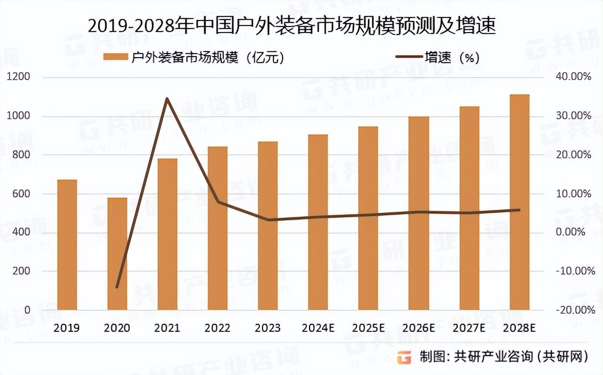 根據(jù)共研網(wǎng)數(shù)據(jù),2023年中國戶外裝備市場規(guī)模為872億元,2023-2028年中國戶外裝備市場規(guī)模的CAGR為5%;預(yù)計(jì)2028年戶外裝備市場規(guī)模有望突破千億元,達(dá)到1113億元。