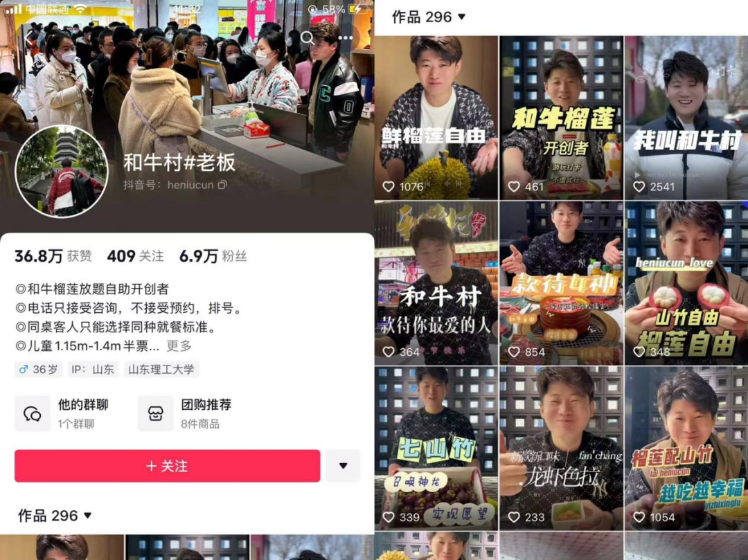 其抖音賬號名為“和牛村#老板”,老板出鏡拍短視頻、做直播,抖音粉絲7萬,單場直播GMV最高1000萬+!此前,新的分店還沒開,只是拍拍裝修期間的視頻 ,就通過預(yù)售全額回本。
