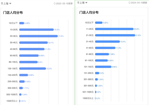 而截至2024年4月19日,人均客單價(jià)在500元以上的餐飲店占比大縮水,從原本的1.44%降低至0.8%,總門店數(shù)減少了900多家。