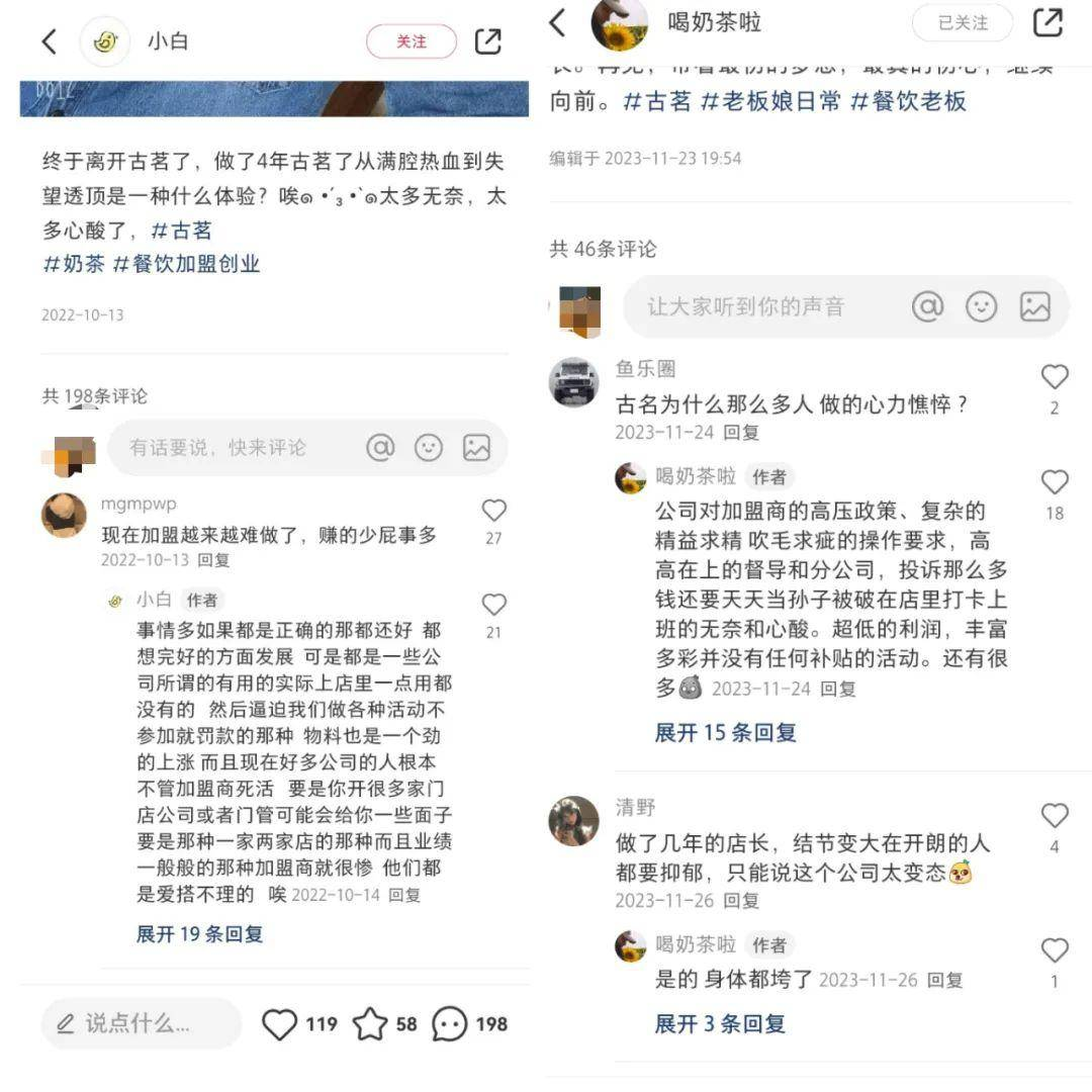 在社交平臺小紅書上,在與古茗有關(guān)的評論區(qū)中,有網(wǎng)友表示,古茗對加盟商存在高壓政策,以及“超低的利潤,豐富多彩并沒有任何補貼的活動”;還有網(wǎng)友表示,“逼迫我們做各種活動不參加就罰款的那種,物料也是一個勁的上漲,而且現(xiàn)在好多公司的人根本不管加盟商死活”。圖源:小紅書截圖