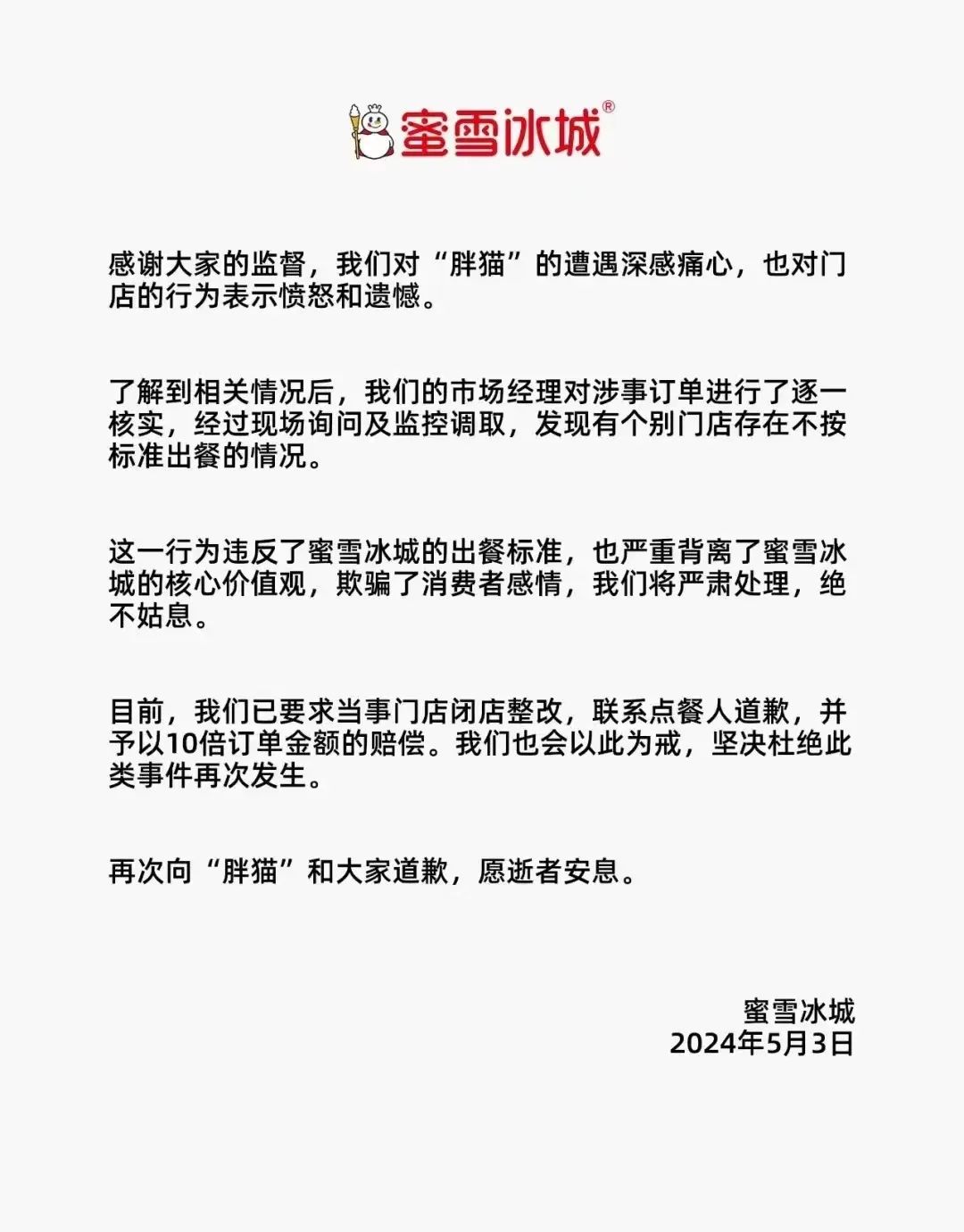 蜜雪冰城也迅速就該事件發(fā)表回應,表示“已經(jīng)要求當事門店閉店整改,聯(lián)系點餐人道歉,并給予以10倍訂單金額的賠償”。