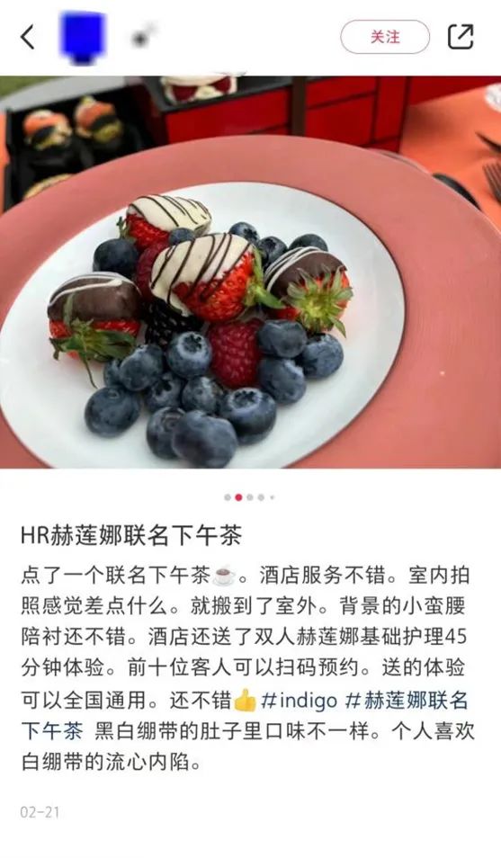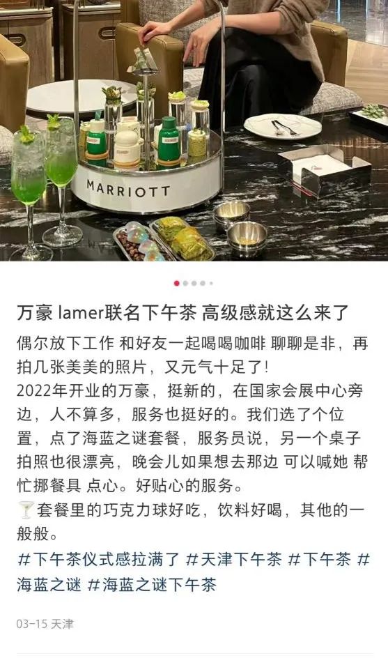 在小紅書平臺(tái),以“美妝 酒店下午茶”為關(guān)鍵詞搜索,可以發(fā)現(xiàn)有不少網(wǎng)紅博主或素人專門去打卡拍照,分享感受。不少人提及酒店的細(xì)致化服務(wù)和舒適環(huán)境,為酒店和品牌帶來了話題度和流量。