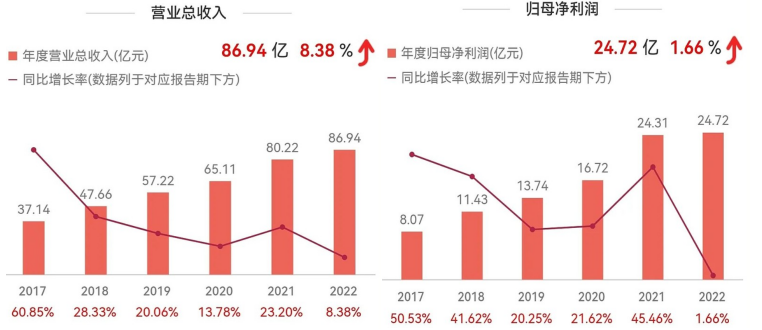 據(jù)財(cái)報(bào)數(shù)據(jù),2022年片仔癀公司實(shí)現(xiàn)營業(yè)總收入86.94億元,同比增長8.38%;實(shí)現(xiàn)凈利潤25.23億元,同比增長2.36%。這是近6年來增幅最低的一年,而片仔癀化妝品亦如此,面臨了6年以來的最低增幅。