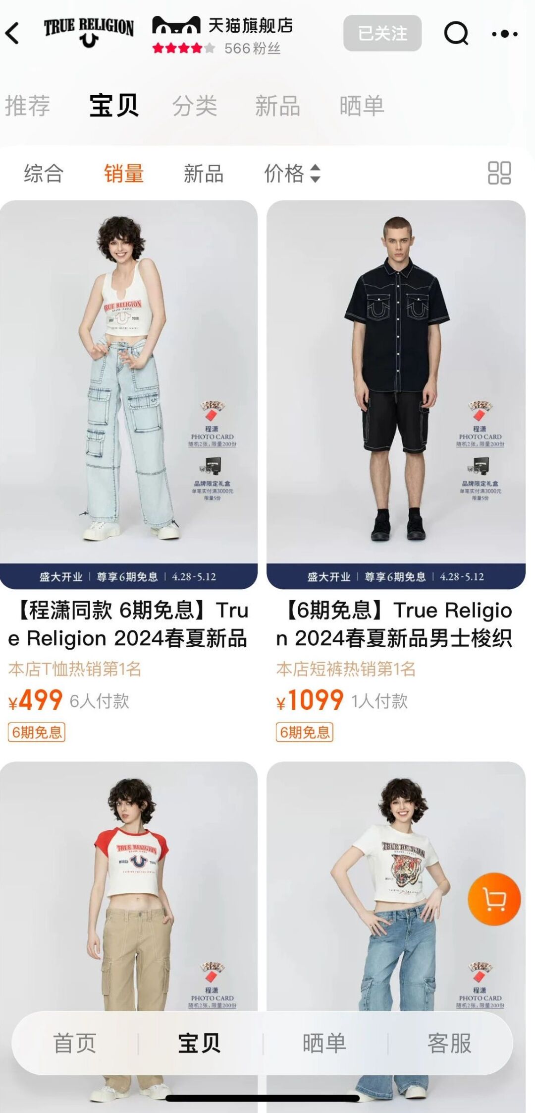 《聯(lián)商網(wǎng)》查閱發(fā)現(xiàn),True Religion天貓旗艦店目前產(chǎn)品定價(jià)為499元至2099元,在天貓旗艦店里,True Religion賣的最好的產(chǎn)品是一件售價(jià)499元的程瀟同款T恤,目前有6人付款,而更多的產(chǎn)品還是0人付款。