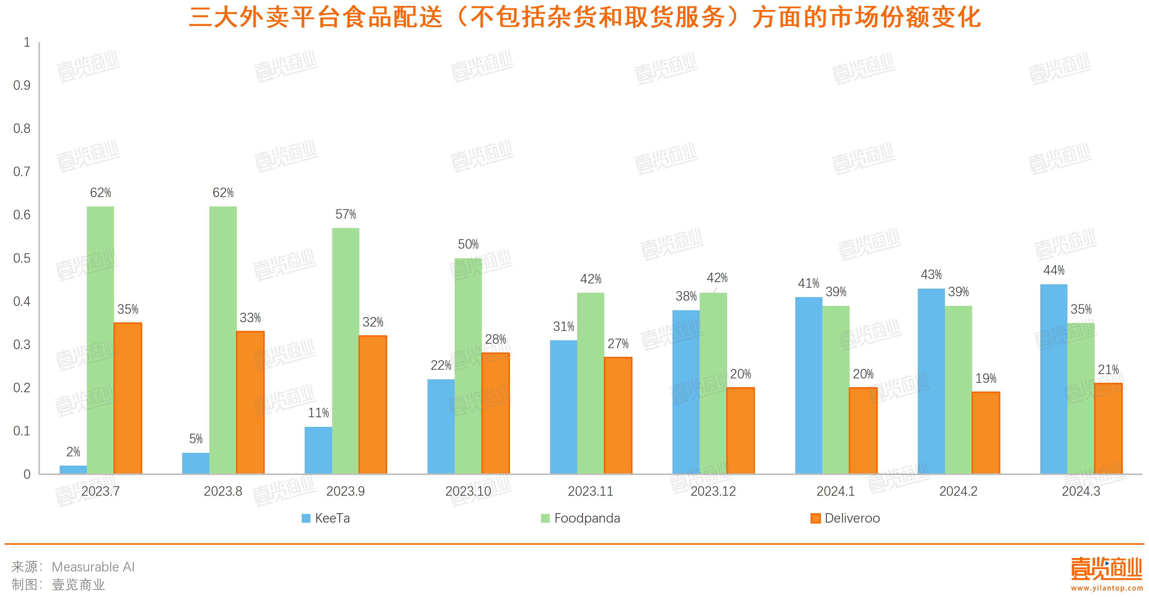 近日,Measurable AI發(fā)布了一組數(shù)據(jù),按2024年一季度食品配送訂單數(shù)量(不包括雜貨和取貨服務(wù))來看,美團香港業(yè)務(wù)KeeTa的市占份額已達到44%,F(xiàn)oodpanda為35%,Deliveroo為21%,KeeTa成功躍升為香港第一大外賣平臺。這距離美團進軍香港市場不到一周年。