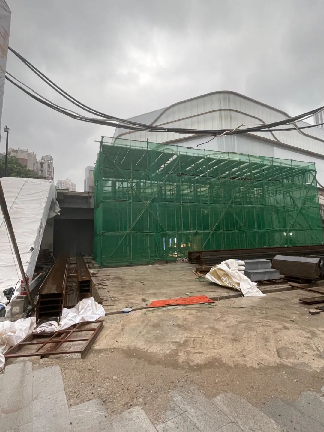 商場盒子部分,目前處于封閉狀態(tài),內(nèi)部景象不明,外部廣場地磚已經(jīng)鋪好一部分,盒子與街區(qū)則通過地下層與扶梯相連。