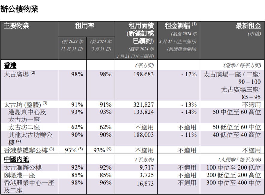 太古坊的出租率為91%,租金下降了13%;港島東中心及太古坊一座的出租率為93%,租金下滑14%;而其他太古坊辦公樓的出租率則為90%,租金下降了11%。