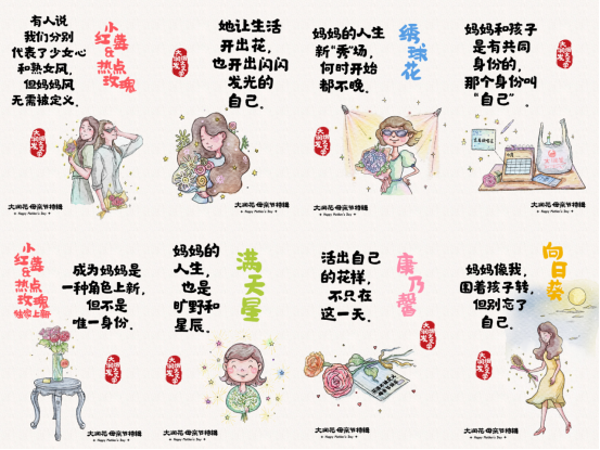 正值節(jié)日新品上市,大潤(rùn)花煙火文學(xué)也推出母親節(jié)特輯!俺蔀閶寢屖且环N角色上新,但不是唯一身份”、“她讓生活開出花,也開出閃閃發(fā)光的自己”、“活出自己的花樣,不只在這一天”……圍繞鮮花表達(dá)了媽媽們一同綻放的人生態(tài)度。