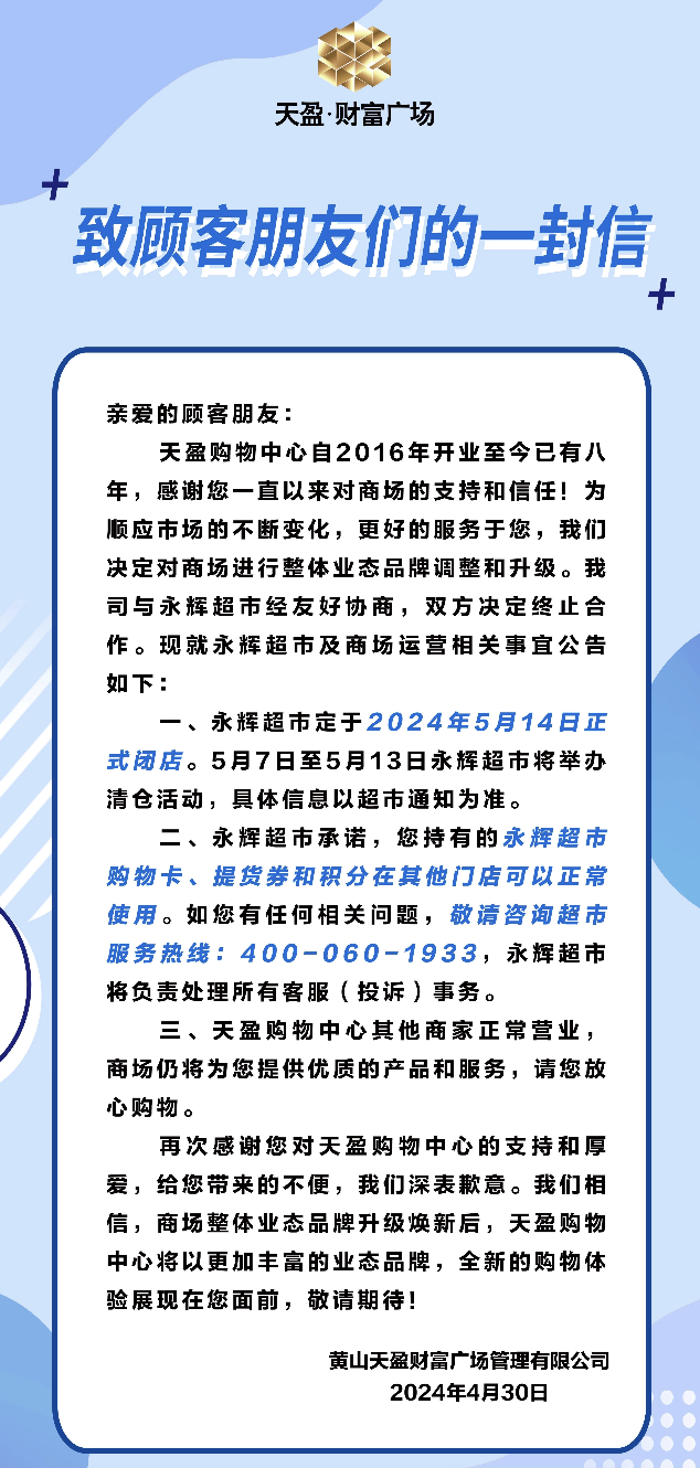 日前,黃山天盈財(cái)富廣場(chǎng)也發(fā)布公告稱,天盈購(gòu)物中心自2016年開(kāi)業(yè)至今己有八年,為順應(yīng)市場(chǎng)的不斷變化,決定對(duì)商場(chǎng)進(jìn)行整體業(yè)態(tài)品牌調(diào)整和升級(jí),與永輝超市經(jīng)友好協(xié)商,雙方?jīng)Q定終止合作。