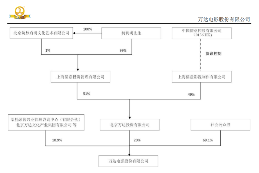 由于萬(wàn)達(dá)投資是萬(wàn)達(dá)電影的控股股東,“儒意系”借此間接控股了萬(wàn)達(dá)電影。“儒意系”實(shí)控人柯利明通過(guò)上述方式,取代王健林成為萬(wàn)達(dá)電影實(shí)控人。